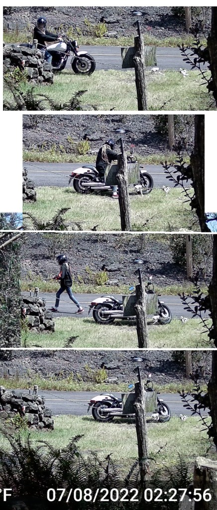 He parked the motorcycle at my driveway entrance, then walked away, leaving it there for several minutes.